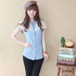 B02 夏装新款超美蕾丝钩花飞袖水洗蓝牛仔衬衫RM69