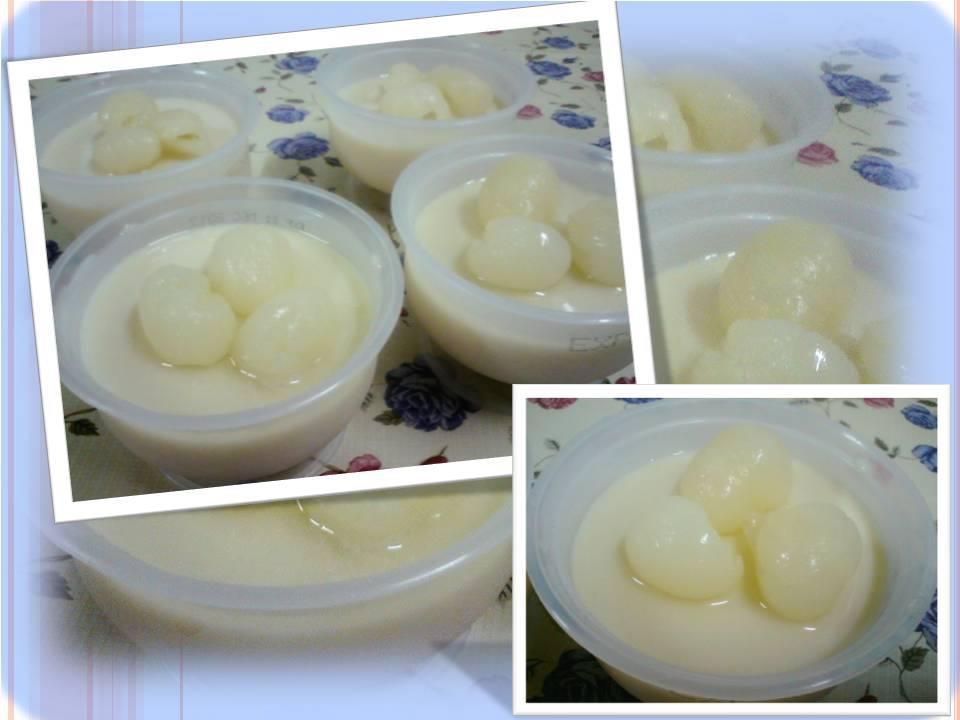 材料:无糖豆浆 1000ml ,鲜奶 250ml ,燕菜粉 2tsp ,罐头龙眼适量 ,龙眼糖水适量