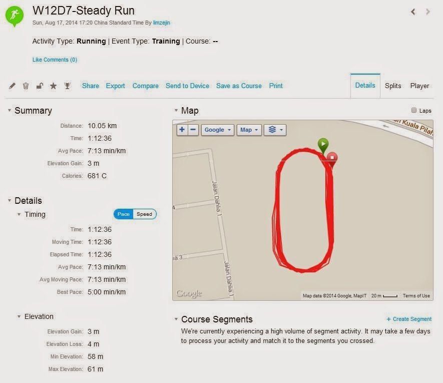 没有上坡和下坡,就轻松了吗?其实不然,没有上坡的痛苦当然也没了下坡的轻松。前面几圈的感觉还算良好,时间久了,圈子绕多了,心理素质的考验才正要开始。第一次在这么炎热的时间练习,也是希望看下自己身体能够在苛刻的条件下跑得怎样。跑起来特别累,皮肤感到特别的烫,最大分别就是很口渴。可能是因为水分流失过多,由于只是10公里,所以没有怎么去补充水分。