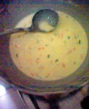 (2)把所有的粉筛过,加入清水,一定要稠,才加入爆香的虾米和红萝卜丝,加葱叶,最后加调味料。