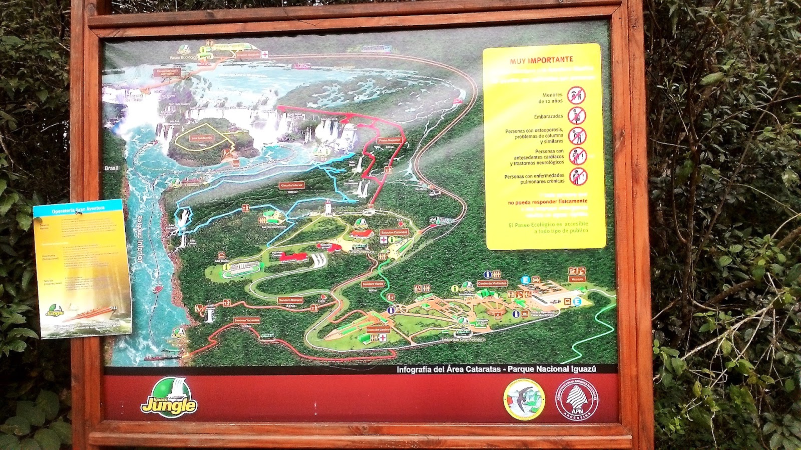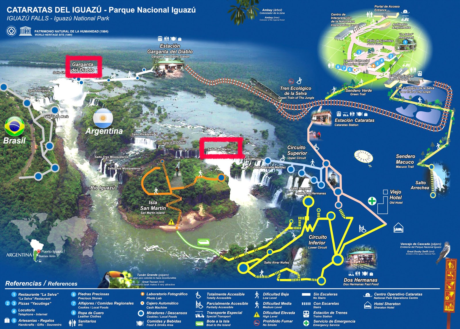 伊瓜苏身处巴西和阿根廷交界处,阿根廷占了八成, 巴西两成,两国皆已在瀑布旁设立了国家公园收钱,想一窥全貌就去巴西那边, 想深入最驚心動魄的Devil’s Throat中,就要到阿根廷这里。