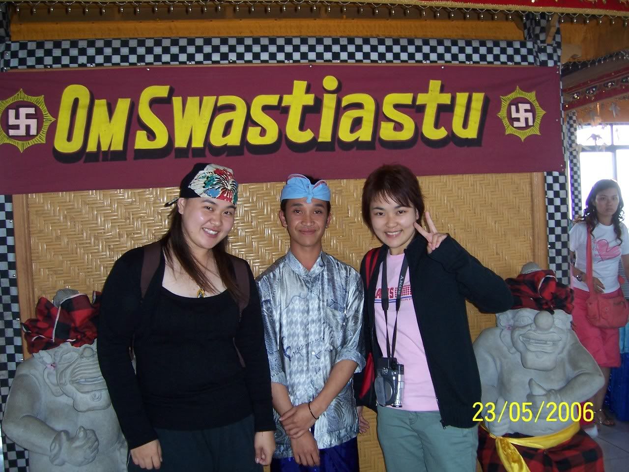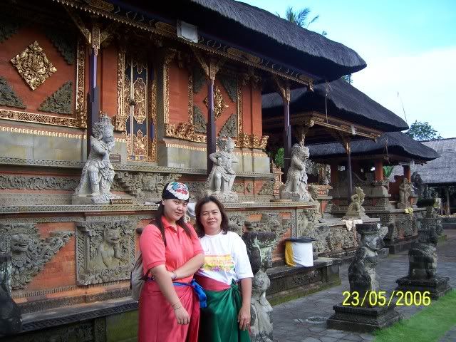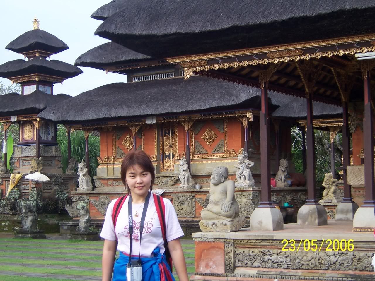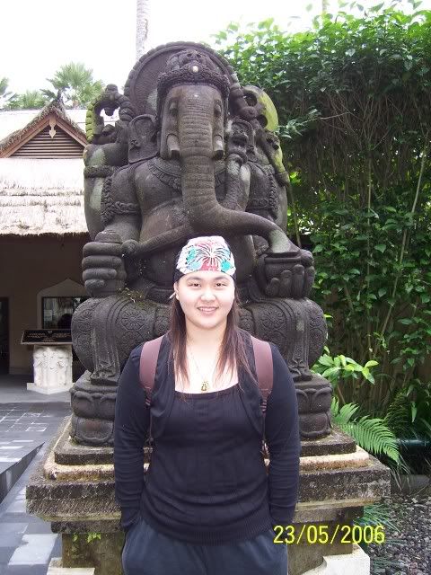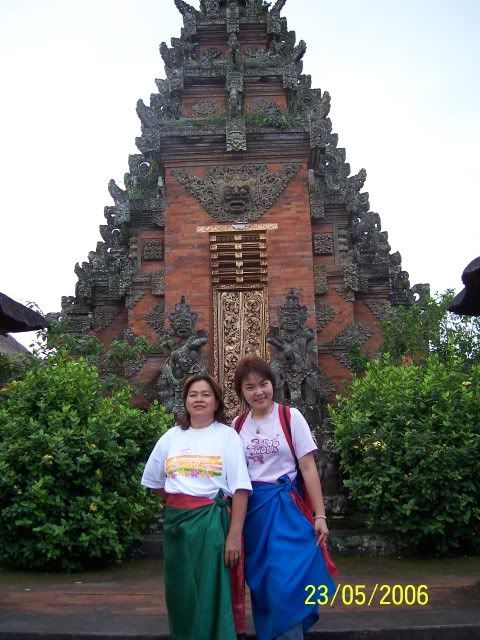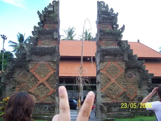 吃完了午餐後﹐我們就啟程去庫塔(kuta)市區了﹐途中會經過一些當地的廟﹐我們都會停下來進去參觀﹐在進去前﹐要用沙籠圍住下半身的﹐沙籠是不用收錢的﹐不過有些地方就要﹐如果自己有最好用回自己的吧﹗﹗!!在去市區的途中﹐我又累得睡著了﹐在到達廟廟的時候﹐還是有點睡不醒的樣子﹐所以拍照的時候樣子就會有點跩...~~~!  |