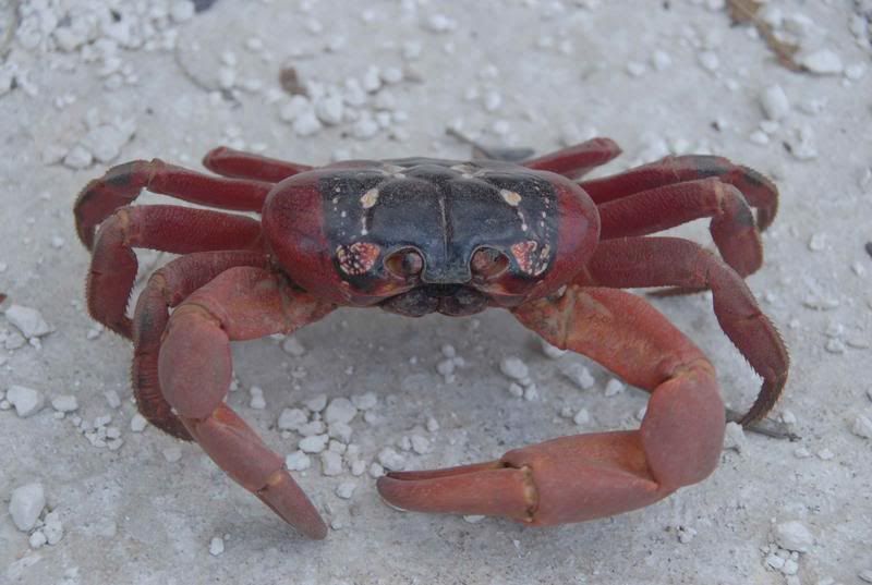 它們一年只出來一次﹐而且時間並不一定﹐大約11月左右﹐而且要看有沒有下雨﹐我們去的是候﹐剛好有一半泰國小伙子跟我們同飛機﹐到了一個星期﹐也沒看到半只﹐因為沒有下雨﹐因為沒有雨水螃蟹長途跋涉的﹐挨不到海邊﹐所以他們有延長多一星期在那﹐幸虧終於下雨了﹐它們就全都出來拉﹐博士說﹐在過一兩天再沒有雨水﹐它們就會等到1月多才會出來﹐所以看你的運氣啦﹐我婆婆去了這麼多次﹐只有這次看到 |