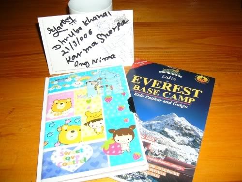 莱拿出爬山衣服让大家签名以作纪念。我也拿出手册及postcard让大家留下名字。
