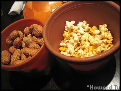 花生和爆米花是无限供应的。在餐厅各角落以大桶盛之任拿。