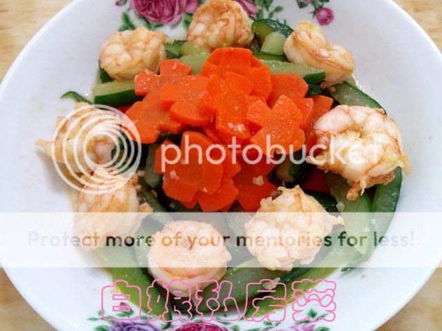 特别准备给儿子的虾仁炒青瓜。。以为他不敢吃甘香酱炒螃蟹肉。。就多准备一个瓜菜。。依然还是红萝卜切花来 ...