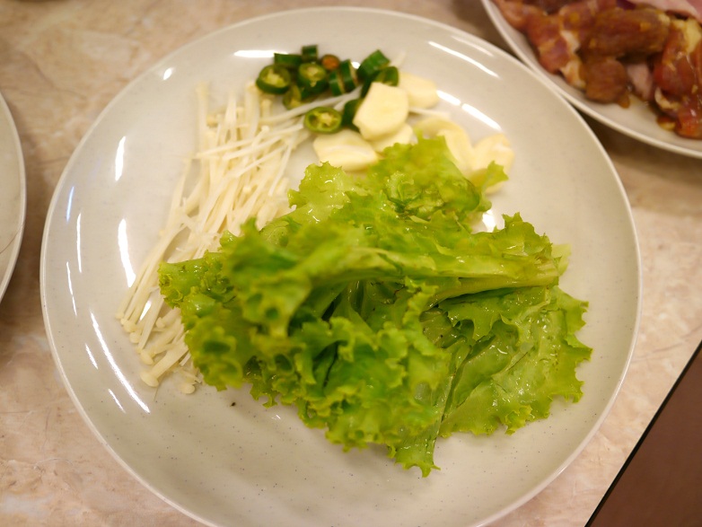 除了单吃Dak-Galbi,还可以用生菜包着一起食用哦!