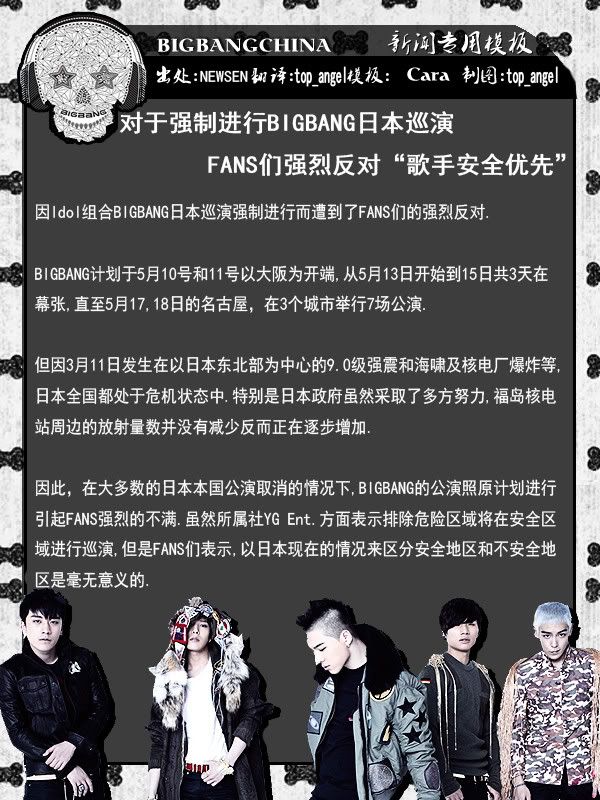 ,歌迷对於BIGBANG预定五六月在日本举办的演唱会抱持绝大的担心及烦恼,而YG也跟歌
