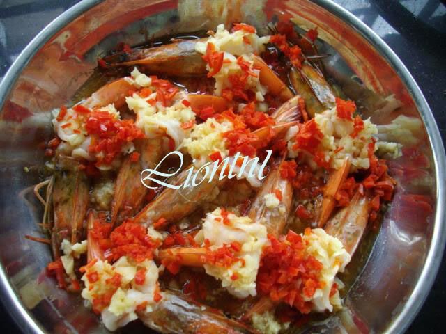 最近看到很多人做这道菜,电视节目也看到,所以就自己动手做~还真的很容易,就是把辣椒和蒜米剁碎,铺在虾上,然后用绍兴酒、酱油、麻油、糖、蚝油和水调成酱汁,再淋在虾上,蒸7分钟就好~别蒸太久,会把虾蒸老的~~ |