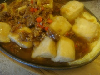 1.烧热一汤匙油,把所有材料‘9除了豆包)放入镬内兜炒一会。
