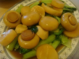 1.烧开二匙油,把7粒袋子菇和7粒蘑菇及一碟小白菜放进去炒。
