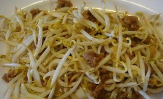 【卤肉碎炒芽菜】 1.烧开一大汤匙的油。 2.把芽菜和素卤肉碎倒入镬内快炒。 3.随即加入适量的盐即可。