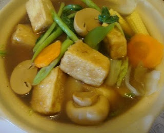 【瓦煲豆干】 1. 玉米芯,四季豆,蘑菇,胡萝卜,长白 全处理了备用。 2. 把白豆干一开六,沾粉炸了备用。 3. 锅内加入一碗水,适量的素蚝油,胡椒粉和(1)的蔬菜煮开。 4. 最后加入豆干和勾芡即可。