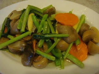 【双菇杂菜】 1.烧开一汤匙油。 2.把处理好的菜心,四季豆,胡萝卜,玉米芯,蘑菇和草菇炒拌。 3.加入少许的水和素G粉炒匀即可。