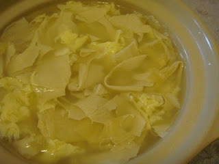 【鸡蛋腐竹汤】 1.准备一小锅的水。 2.把腐竹加入(预先浸软),煮至腐竹转乳黄色(或是水少了一半分量)。 3.加入适量的盐和打撒的蛋,即可熄火。