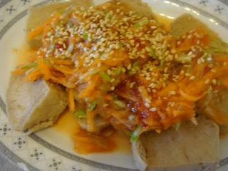 【干炸豆腐】 1.三大汤匙面粉和80-100ml清水混合(大概的分量)。 2.加入适量的胡椒粉,素G粉和盐搅匀。 3.加入芽菜和胡萝卜丝混成糊。 4.豆干切对半,把芽菜糊酿入豆干内。 5.用大火炸即可。