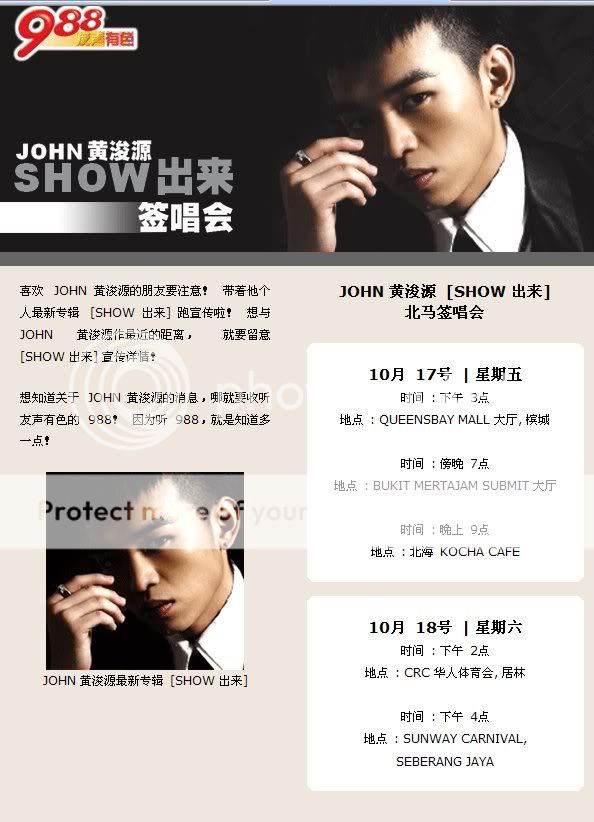 11/10/08 (六) 1.00pm 签唱会:Cheras Leisure Mall 大厅 蕉赖 公開,免費入場