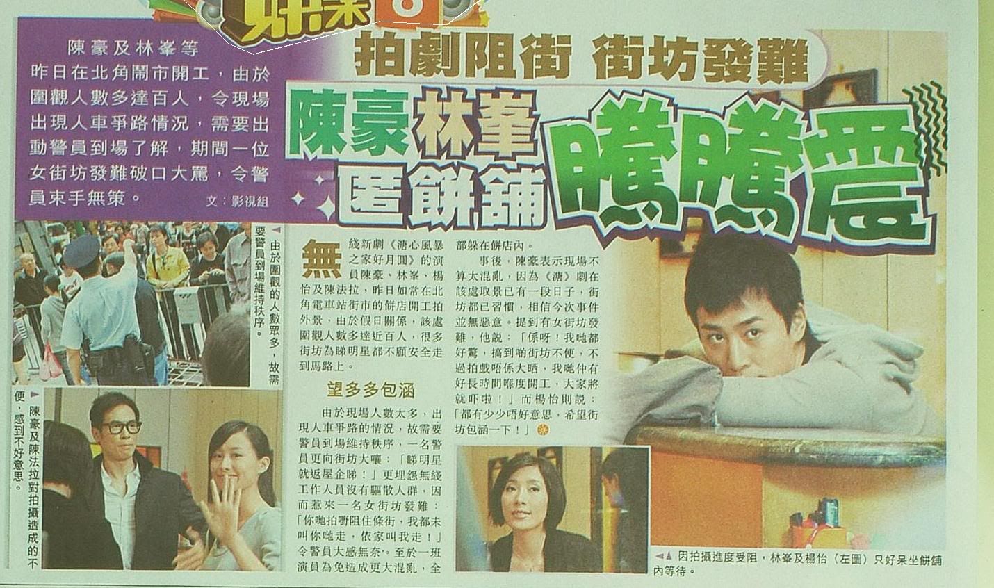 昨 日 陳 豪 、 林 峰 、 楊 怡 及 陳 法 拉 在 北 角 拍 攝 《 溏 心 風 暴 之 家 好 月 圓 》 外 景 , 期 間 不少 市 民 圍 觀 , 一 度 聚 集 百 人 , 由 於 現 場 靠 近 電 車 路 , 很 多 途 人 為 見 明 星 更 不 顧 安 全企 出 馬 路 , 陳 豪 、 林 更 被 現 場 的 師 奶 們 大 讚 靚 仔 。 未 知 是 否 有 人 投 訴 , 期 間 有 警 員到 場 了 解 , 更 向 市 民 大 嚷 : 「 睇 明 星 就 返 屋 企 睇 ! 」 警 員 又 指 工 作 人 員 沒 有 叫 人 群離 開 。