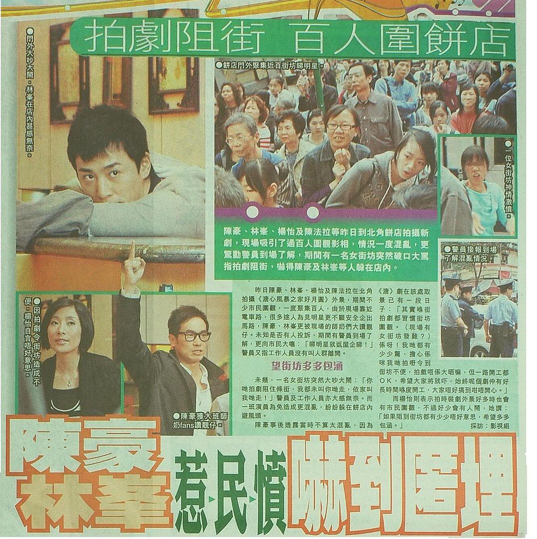 陳 豪 、 林 峰 、 楊 怡 及 陳 法 拉 等 昨 日 到 北 角 餅 店 拍 攝 新 劇 , 現 場 吸 引 了過 百 人 圍 觀 影 相 , 情 況 一 度 混 亂 , 更 驚 動 警 員 到 場 了 解 , 期 間 有 一 名 女 街 坊 突 然 破口 大 罵 指 拍 劇 阻 街 , 嚇 得 陳 豪 及 林 等 人 躲 在 店 內 。