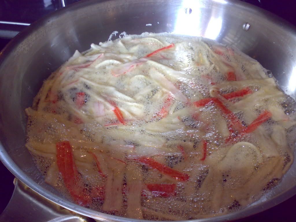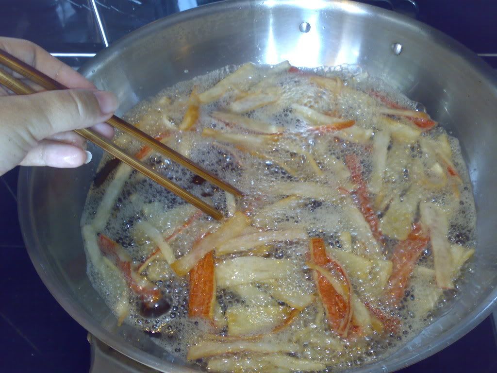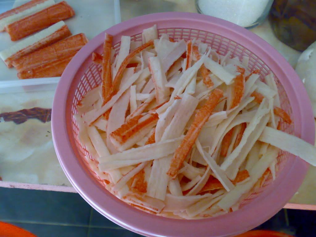 梁夫人。。 这个蟹柳可以用那个鳕鱼香丝来代替。。也是很好吃。。如果用鳕鱼香丝就不用撕,而且油不会喷到手,因为没有水份。。
