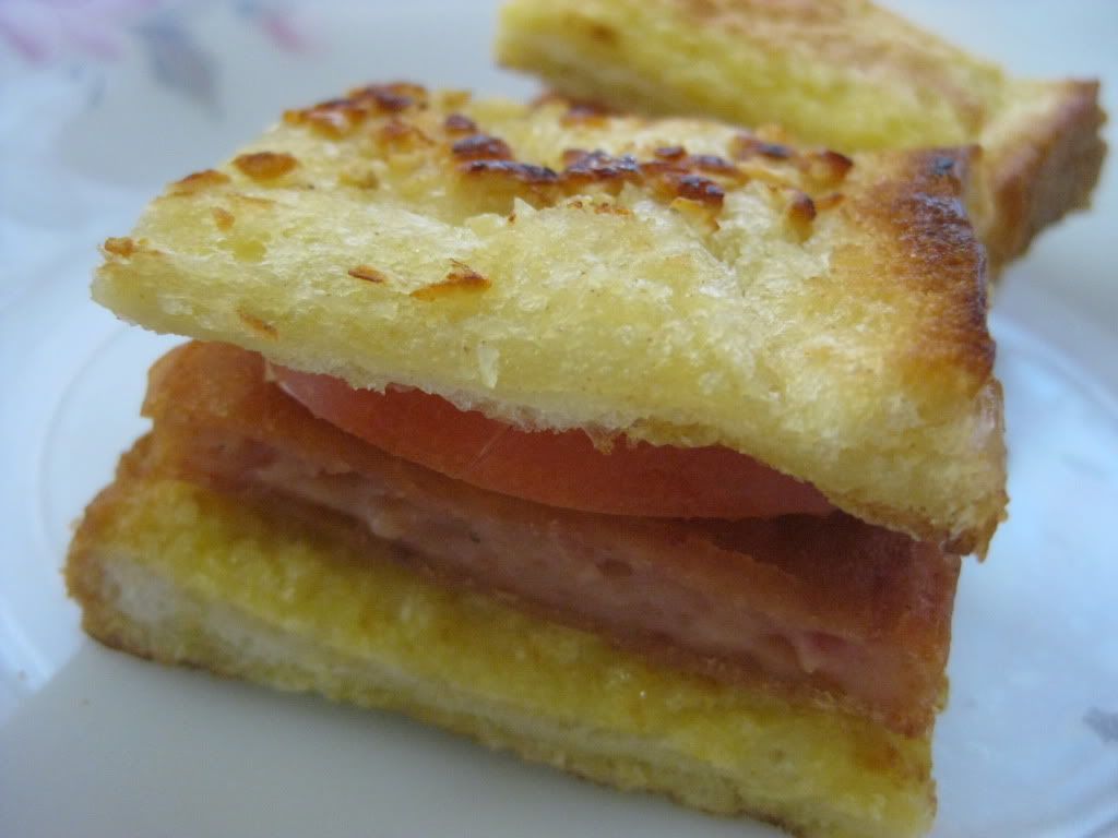 是午餐肉来的。面包有双重口味,上层是脆口牛油蒜米,下层是甜蛋煎面包。