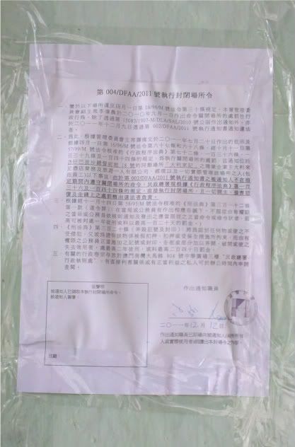 民署上周五向食肆发出执行封场通知书,勒令必须在廿四小时内关闭。惟经营者未有理会,於周六、日连续两天营业。民署昨日上午十时联同治安警到上址封场,食肆无营业,大门关上。民署在食肆外拉起封条,並在不同位置贴上“执行封闭场所令”,内容清楚列明执行理据,封场过程顺利。
