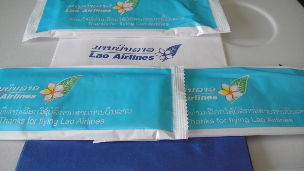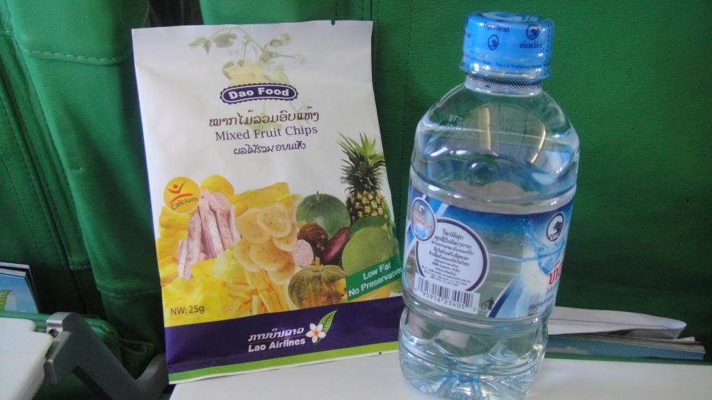 终于可以上飞机了。空中小姐长得还漂亮,空中少爷就扣分了。不过 Laos 飞机比AA 舒服多了。途中还免费派送一小罐矿泉水及一小包零食。