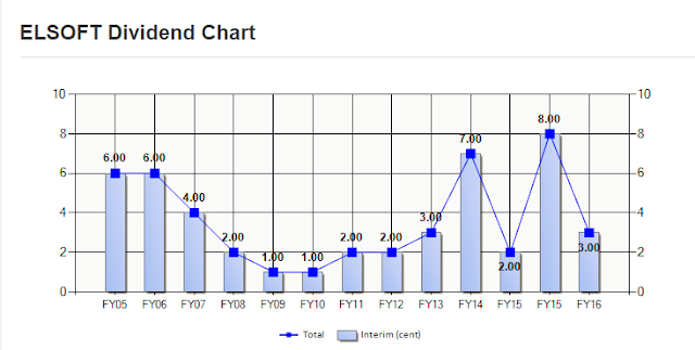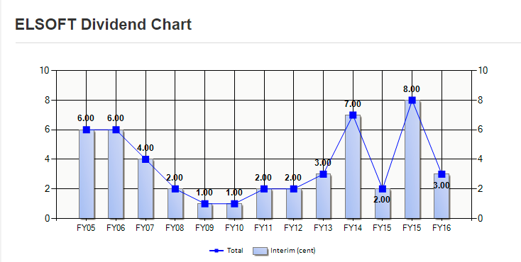 如今Elsoft的PE来到10.93,还是少于15的。而股息率提高至4.21%,因为好成绩,公司当然也随着股息政策40%而提高这次股息发放咯~ 从去年同季的2仙来到这次的3仙。