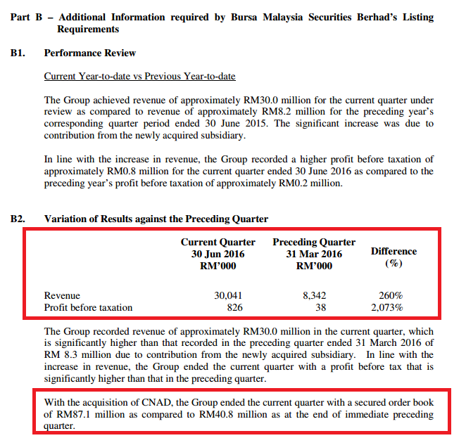 截至2015年6月30日為止,該公司首季淨利為131萬8千令吉(每股淨利為0.04仙),前期淨利為22萬5千令吉(每股淨利為0.11仙),營業額為821萬令吉,前期為871萬7千令吉。