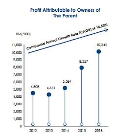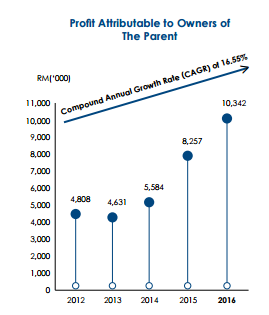公司在2005年底上市,净利从2005年的RM2.2 mil进步到FY2016的RM10.342 mil, 过往5年的CAGR 平均高达16.55%。公司的市值也从2012年6月30日的RM34 mil增长到2016年6月30的RM136.1 mil,4年增长了401.5%。