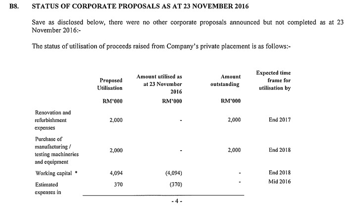 为了获得更多资金发展片地皮以及建筑,2015年12月MIKROMB第一次Private Placement获得了RM8.5 mil。公司截至2016年9月30日已经使用了RM4.464 mil,剩余的4 mil分别会用在装修新厂以及买进新的机械器材。