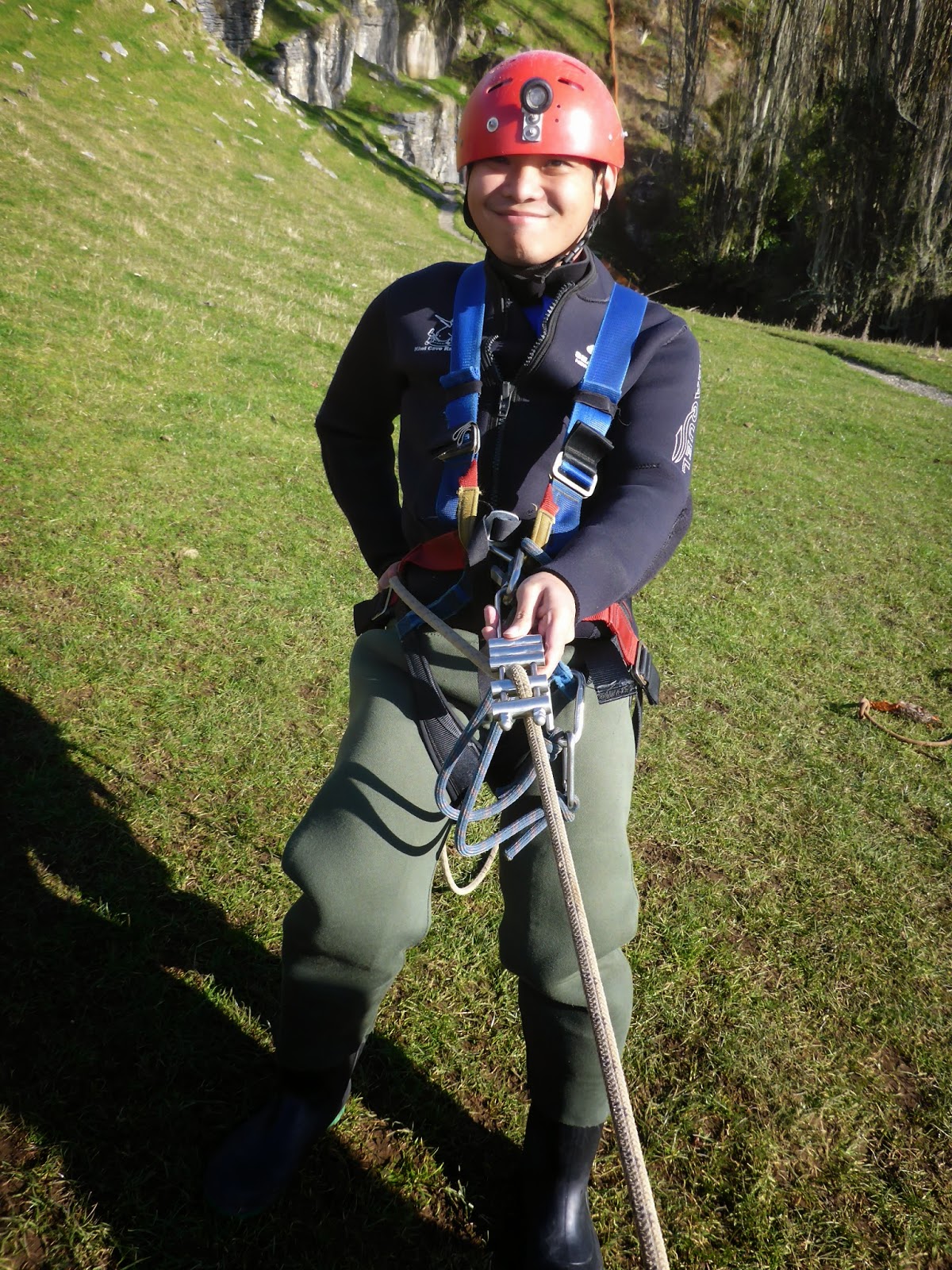 开始前我们得先学会如何操作降绳,如何让自己缓慢的往下降。在练习途中我们的导游 Amy 帮我们拍个大合照,我知道我们的一身装扮都很奇怪,哈哈。