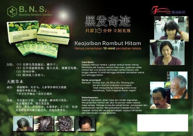 照片都放了, 在上面啊。。。是一包一包的。。。 你没看见吗?是 noni black hair magic. |