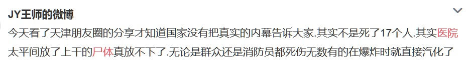網友“萌萌熙i”稱:天津的朋友說醫院滿滿的都是傷員或屍體,有個朋友在醫院工作的,說昨晚已經接了300多個,徹底搶救回的只有幾個