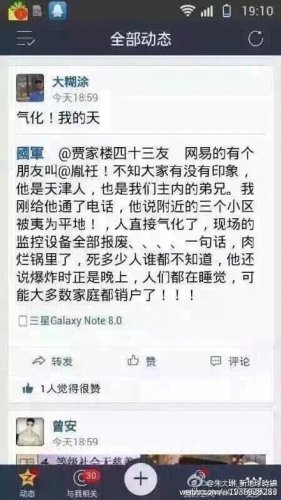 天津微信朋友圈裡流傳著這麼一條消息:“看到的,半夜聽到打雷了,然後窗戶就突然震碎了,後來就著火了。今天大街上全都是斷臂殘肢。看到一個消防員,他對我說,幫我抬一下屍體吧,我都抬了200多個了。一個男的一遍遍地抬著屍體,哭了,說抬不過來啊,媽的,抬不過來啊。醫院全都是鏽鐵的血腥味。”