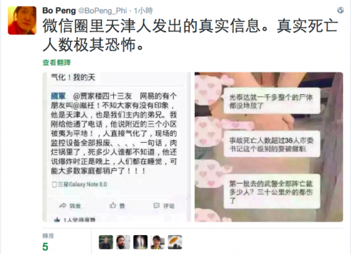 天津網友爆料:“第一波9個中隊和港務局碼頭3個專職隊進去後發生第一次爆炸,方圓一公裡房子全變廢墟,這些都至少180人,後來碰到了一個軍人說光抬屍體都抬了二三百了”。