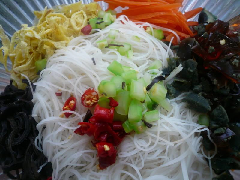 其他的材料如,米粉(烫过),萝卜,辣椒,木耳,鸡蛋(煎蛋皮),皮蛋,江鱼子,葱粒等。可以根据自己喜好而加入。