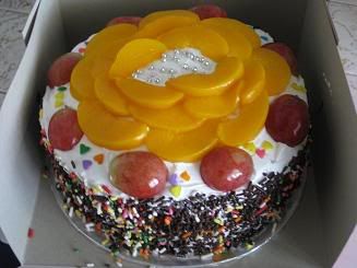 我看见你做水蜜桃,我又学你了。。。哈哈。。我用一罐水蜜桃哦,4粒葡萄(刚好妈买了,拿了4粒)第一次做的,做给我家婆。。母亲节的蛋糕。。涂搽那鲜奶油真的很考我功夫。。他们还笑说我“几像买回来的哦,有样学样哦”。。哈哈。。