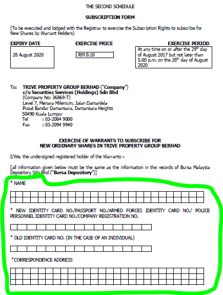 Instrument Category | Securities of PLC | Instrument Type | Warrants | Description | BONUS ISSUE OF 668,295,786 WARRANTS IN TRIVE PROPERTY GROUP BERHAD ("TRIVE" OR THE "COMPANY") ("WARRANTS") ISSUED PURSUANT TO THE BONUS ISSUE OF UP TO 713,740,158 WARRANTS ON THE BASIS OF ONE (1) WARRANT FOR EVERY TWO (2) EXISTING ORDINARY SHARES ("TRIVE SHARES" OR "SHARES") HELD BY ENTITLED SHAREHOLDERS OF TRIVE AT 5.00 P.M. ON 25 AUGUST 2017 |