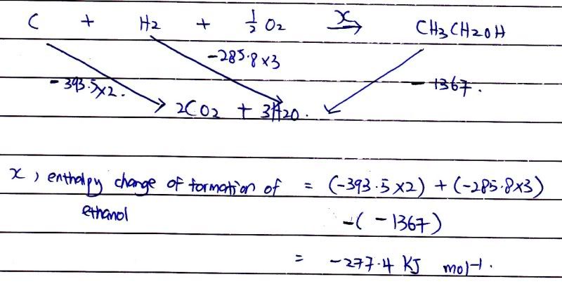 The combustion of 4.6g of ethanol has evolved 136.7 kJ of heat at 25* and 1 atm.Calculate the standard enthalpy of formation of ethanol.Given enthalpy of formation of CO2 =-393.5KJ mol-1, enthalpy of formation of H2O = -285.8KJ mol-1.....So my ques is,, how the energy cycle looks like? |