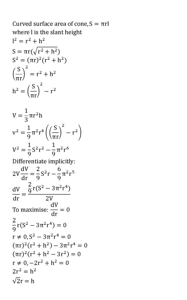 A right circular cone has base raduis r and height h. As r and h vary, its curved surface area is kept constant. Show that its volume is a maximum when r = r√2h. |