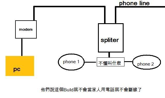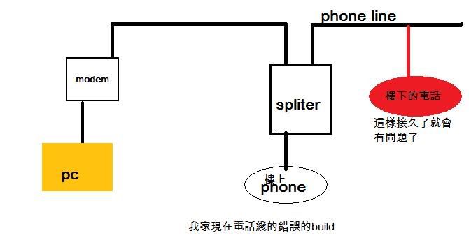 电话线来进第一个 splitter,然后分去楼下的电话,和楼上的splitter