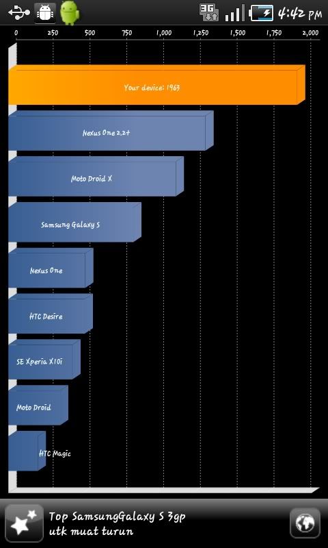 刚才RUN了下BENCHMARK...MS超频后(800 mhz)得到的分数比没超频前多了一倍。。。已经差不多跟HTC DESIRE一样了 |