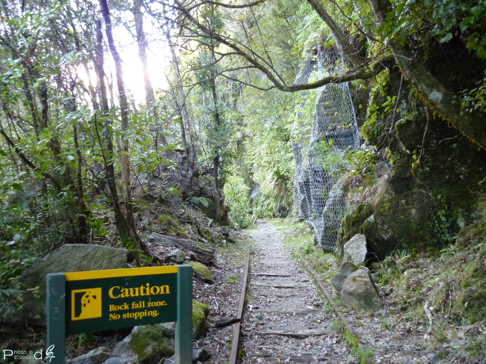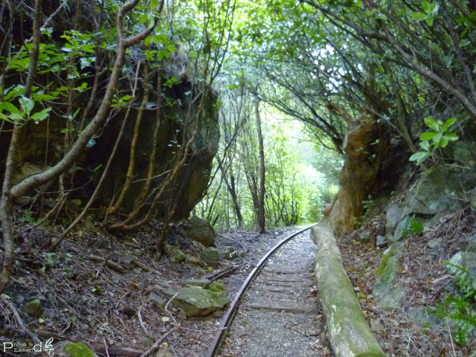 一路上我就沿着这个旧铁道前进,这个步道的难度并不高,以前是铁路,不可能有上下幅度很高的斜坡。其中部分铁道已经损坏,但都已经有步道接回,所以大家不必太担心会走的很辛苦。只是这个步道因为一些路段是有着落石的风险,所以有时候会有告示牌警告健行者不要在这段步道停留太久,以免真的发生落石时会被打到。步道不时会经过一些以前采矿时建的建筑物,这些建筑物也有准备椅子给健行者坐着休息。