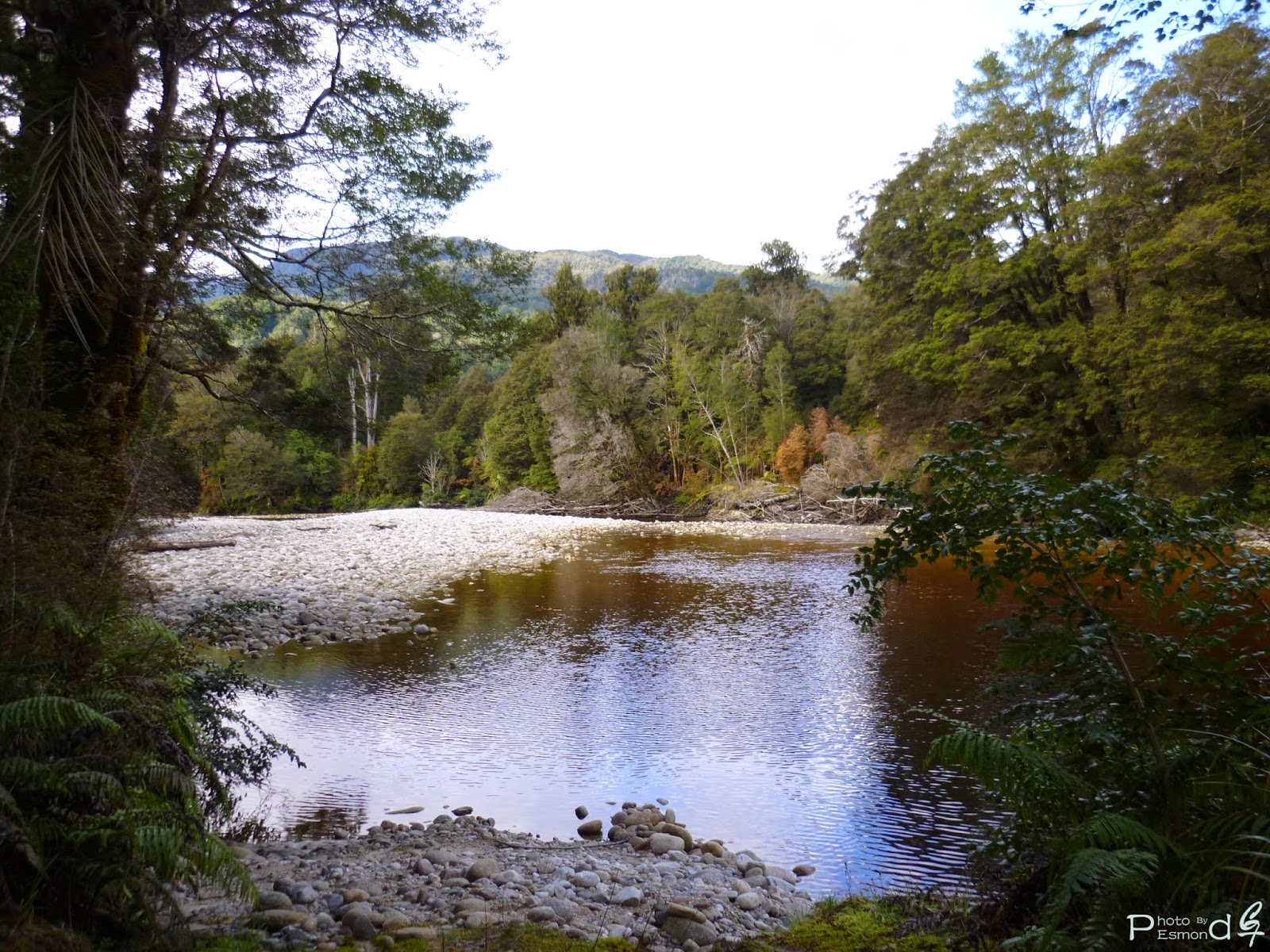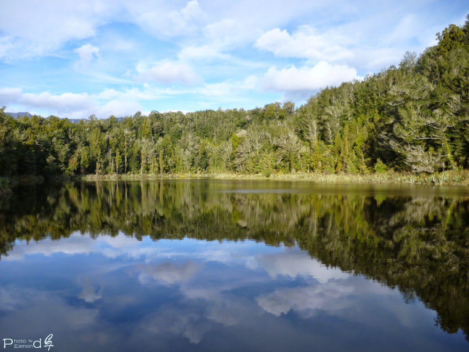 由于这里的地理环境关系,这个湖可说是完全没有风,再加上这个湖是没有鱼,这就表示这个湖的湖面十分平静,而一个很平静的湖面就像一面镜子咯!!!相比在Oparara Basin看到的湖,这个湖真的蛮平静,倒影的画面还蛮清晰的。。。