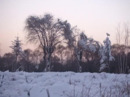 一路上的风景都是白茫茫的。当火车开进吉林是,我们看见了雾松。上天对我真好,知道我没时间到吉林看雾松,就在我回北京的途中让我瞧瞧雾松的风采。一整排的雾松,好壮观。