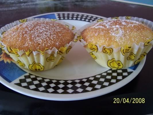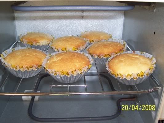 最后加入低筋面粉、泡打粉、香草精拌勻,把面糊倒入小紙杯內,以180度烤20~25分鐘。 |