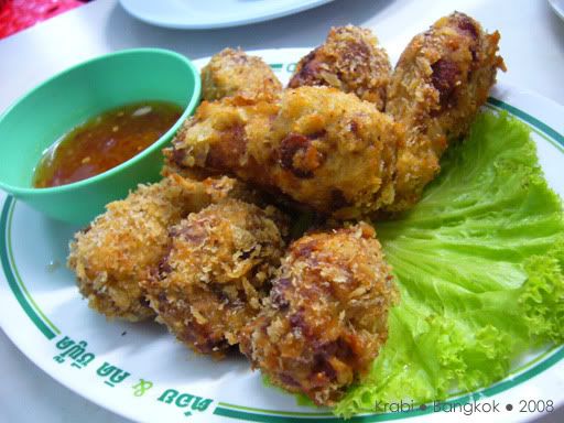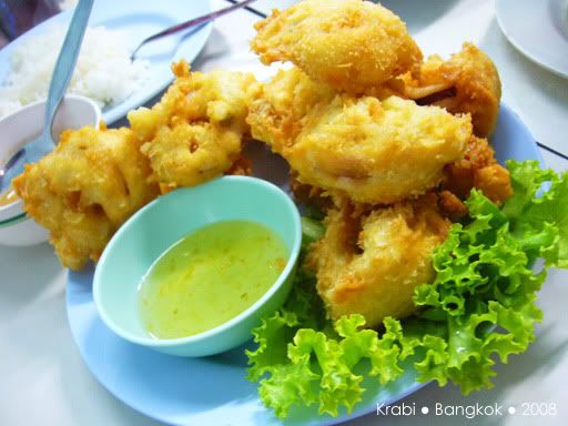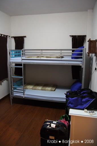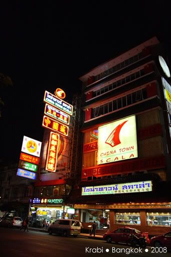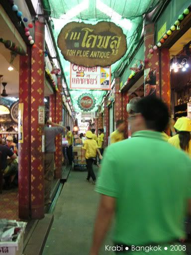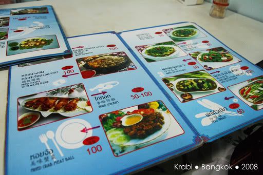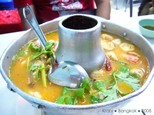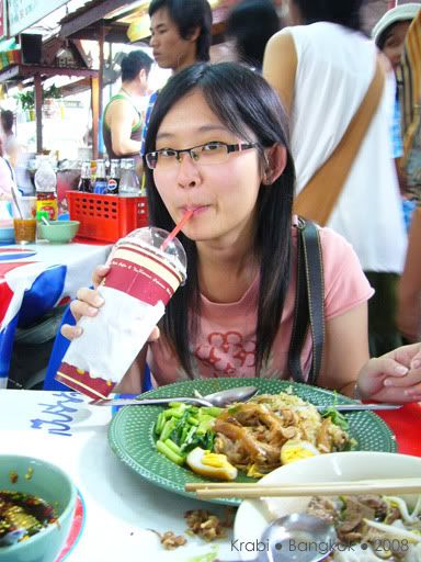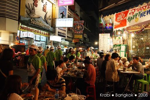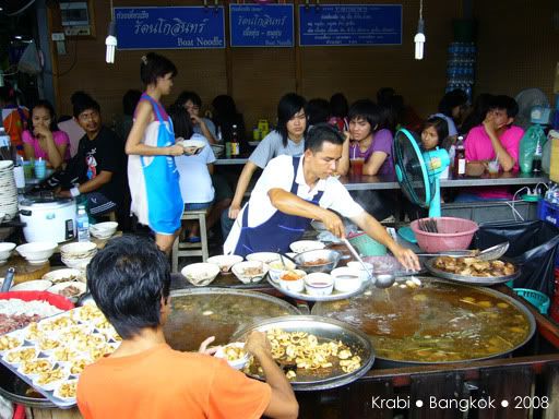 好不容易才等到出租车来接我们,其实司机比原定的时间早了半小时,其实是司机不怀好意的把我们送到附近的甲米纪念品专卖店,还以为我们会消费好让他赚点介绍费。当然,我们什么都没买,司机好像有点不高兴,但我们还是管不着那么多了。司机只好送我们到巴士站,也没说声拜拜就走人了。巴士看起来还不错,有巴士小姐还派发一些糕点,但车上是看不到有任何外国人。看来除了背包客,很少人会像我们这样,愿意舟车劳顿的搭12小时的巴士前往曼谷。8点左右,巴士停在一家餐馆让我们用晚餐。一下车,我们都还来不及跟上, 其他乘客都冲进餐馆了,都不知哪一座是我们巴士的。这里真的一个外国人都没有,所有人都讲泰语,真不知道要问谁。幸好多一阵子就遇到了刚才的巴士小姐,虽然连她也听不懂英语,但还好她明白我们是离群了,就带我们进去。餐馆里很大,所以真的认不出那一组才是我们巴士的人。坐下来后,我们都决定吃快点,一定要跟上大队,不然又离群就糟了。这一餐是包在车费里的,有几道菜和汤,还有任吃的白饭,食物味道不怎么好吃,也因为太累,没什么胃口,赶紧吃了些就跟着大队上车了。上车后,又是会周公的时候了,就一直睡到隔天凌晨到曼谷车站去。