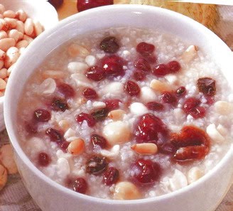 [原料] 芡实、薏仁米、白扁豆、莲肉、山药、红枣、桂圆、百合各6克、粳米150克。
