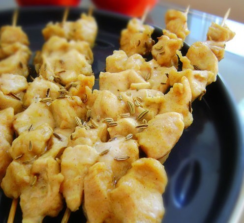 3、用竹签串起来,微波高火3分钟,翻面二分钟,可以撒些你喜欢的孜然或是辣椒粉什么的。